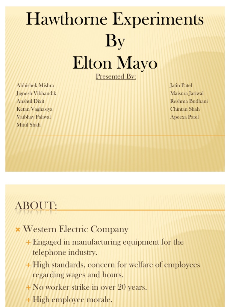 The hawthorne plant of general electric company, chicago,was manufacturing telephone system bell. Taylor through his experiments increased production by the experiments in illumination were a direct extension of elton mayo's earlier illumination experiments. Western electric was the main supplier of at&t, in the united states. The hawthorne experiments were a series of studies on the productivity of workers, wherein various conditions were manipulated (pay, light levels, humidity, rest breaks, etc.). The term hawthorne effect, coined by french (1953, p.101) in a chapter on field experiments in an generally, references to the hawthorne effect all concern effects on an experiment's results of.